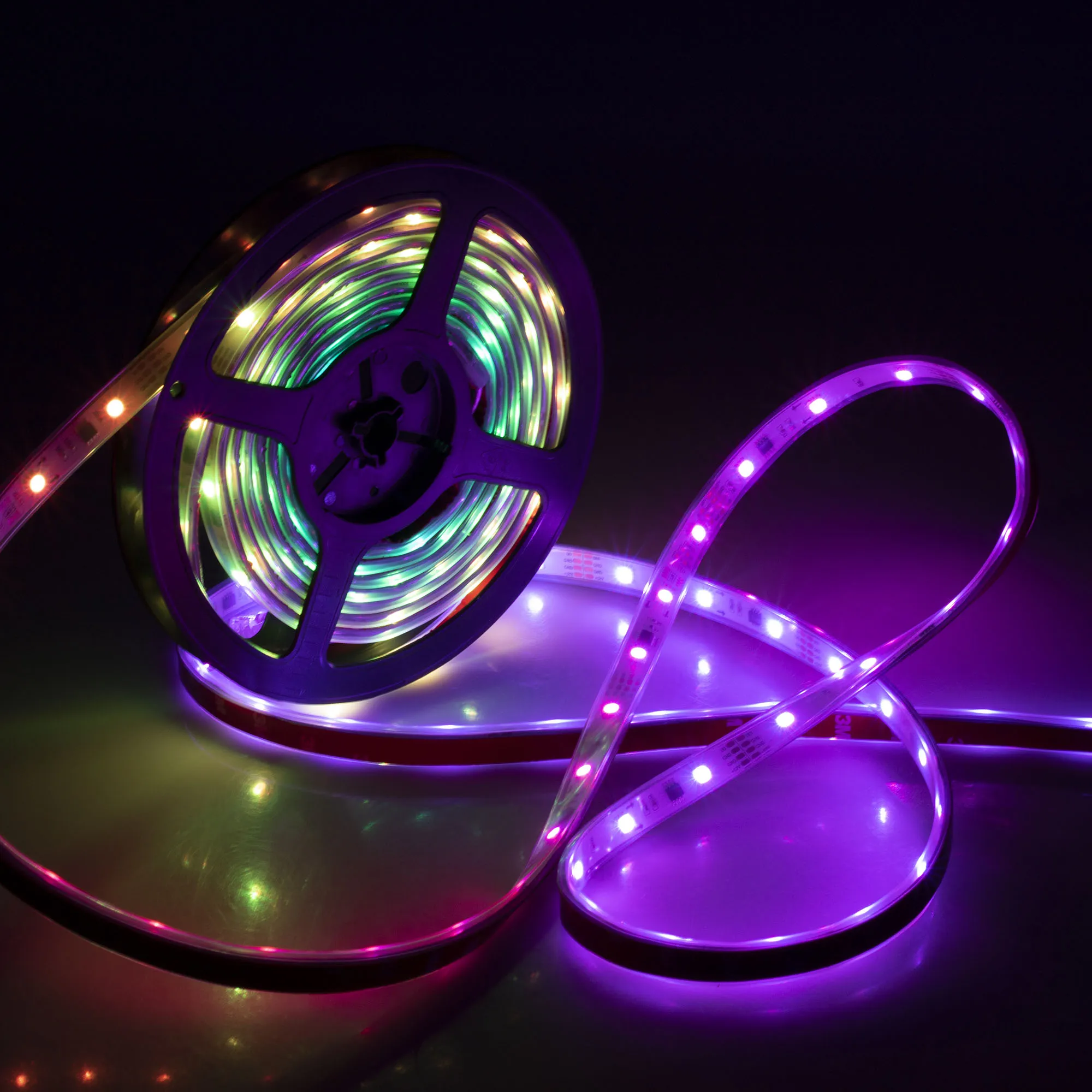 Поставка под заказ от 495 м.Герметичная лента «Бегущие огни», в силиконовой трубке с герметиком внутри (IP67), со СКОТЧЕМ 3M на обратной стороне, с драйвером 1804, встроенный в ленту контроллер с циклическим автозапуском 300 программ (Auto mode) и подкл-ем внеш. контроллера. Длина 5м, 150шт LED RGB 5060, 10 pixel/m (1 pixel = 3 LED). Питание 12V, ном. мощн. 5 Вт/м, макс. мощн-ть 6,5 Вт/м (статический белый цвет). Ширина 12 мм. Герметичные КРУГЛЫЕ коннекторы.
