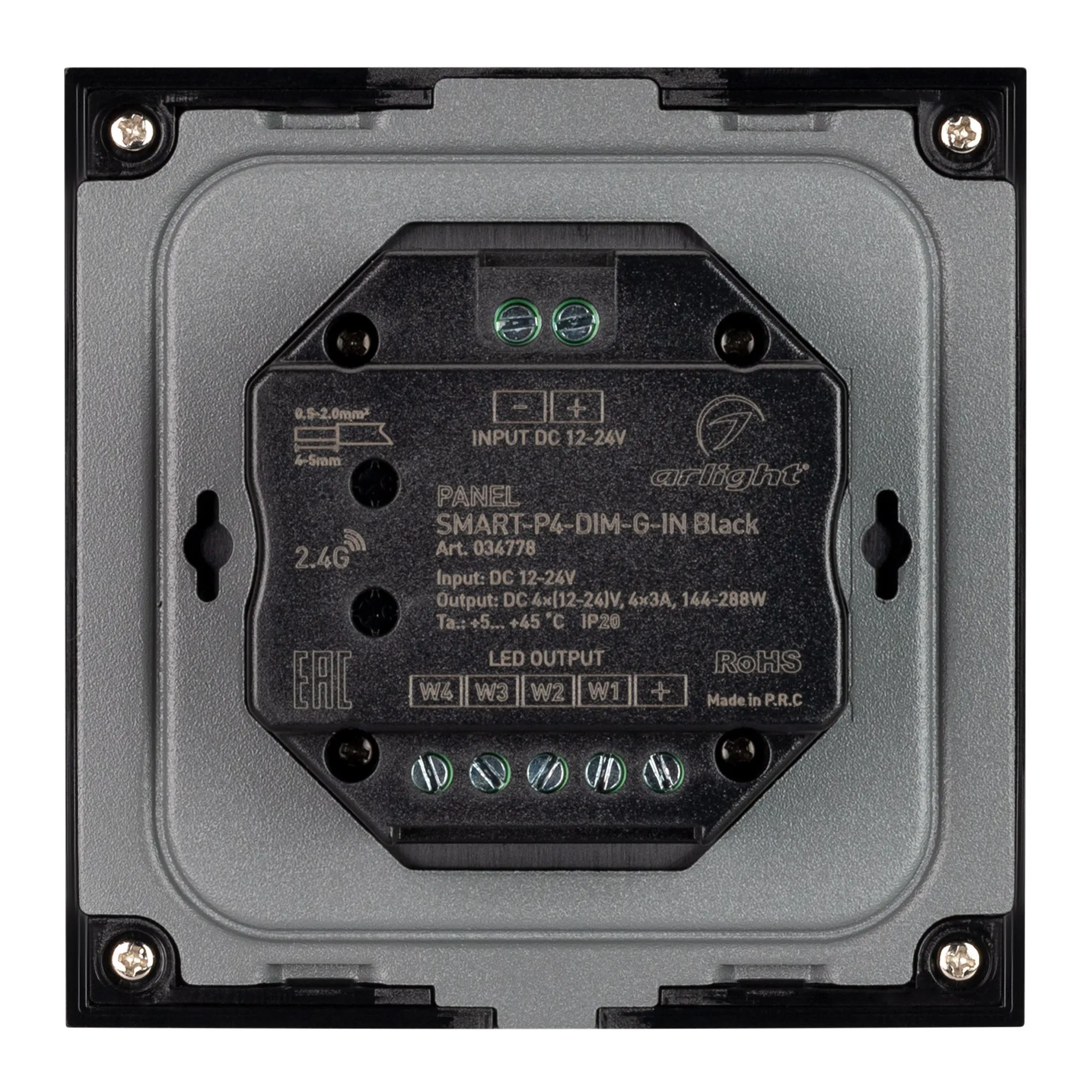 В магазине Мельковский Свет Вы можете купить "Панель SMART-P4-DIM-G-IN Black (12-24V, 4x3A, Sens, 2.4G) (Arlight, IP20 Пластик, 5 лет)"